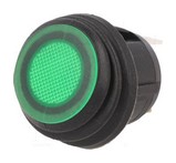 koléb. vypínač 1pól, 20A/14V DC, zelený prosvětlený (LED 14V DC), odolný proti působení vody a prachu (krytí IP65), max. odpor kontaktu: 50 mohm, provoz. teplota -20...85°C, rozměry: průměr 25mm, průměr montážního otvoru: 20,2mm, tlouštka panelu: max. 2,5mm, konektory 4,8x0,8mm • použití zejména v automobilech s 12V palubní sítí