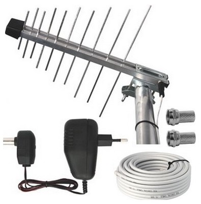 sada venkovní antény se zesilovačem, zisk 19...22dB, nap. zdroje 12V /100mA, koaxiálního kabelu (10m) a F konektoru (2ks) ( moderní logaritmicko-periodická anténa pro příjem UHF pásma osazená novým typem nízkošumového předzesilovače, speciálně vyvinutého pro příjem DVB-T signálu • předzesilovač v anténě obsahuje 4 násobný filtr 4G LTE pro odrušení GSM 900MHz signálu a tzv. switch systém, s funkcí zaručující perfektní příjem signálu jak s přiloženým napájecím zdrojem (v místech vzdálenějších od vysílače s nízkou úrovní signálu), tak i bez tohoto napájení (v místech s dostatečným pokrytím signálem) • možno napájet přímo ze set-top-boxu • rozsah: 21. - 69. kanál, 470-790MHz • délka antény 440mm • napájení zesilovače možno od 5 do 24V= )