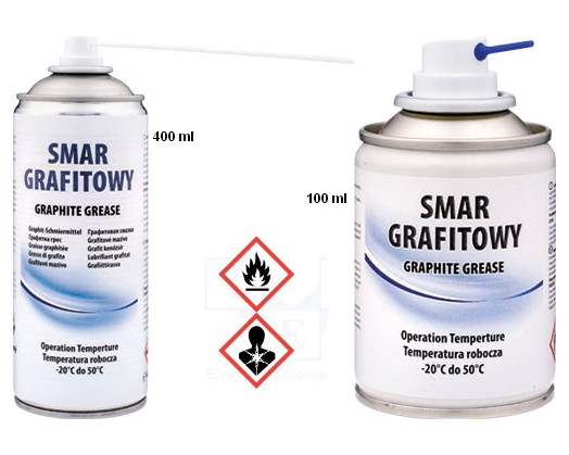 grafitové mazivo, aerosol ( pracovní teplota: -20…50°C, odolnost vůči vodě, použití preparátu: mazání, vlastnosti: nezpůsobuje korozi )