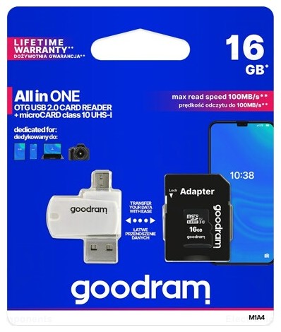 paměťová karta micro SDHC 16GB Goodram, Class 10 UHS U1, čtení 100MB/sec, zápis 10MB/sec, přiložena USB 2.0 čtečka a SD adaptér