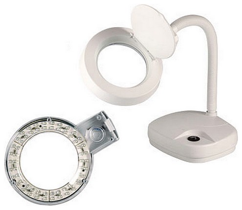 stolní lupa na stabilním podstavci s ohebným ramenem, do základní plastové čočky 3 diopt. (1,75x) je vestavěna čočka o průměru 20 mm poskytující zvětšení 8 diopt. (zvětš. 3x) vybavené klapkou přikrývající čočku, 60 LED diod /3,5W, napájení: 230V~AC 50/60Hz, hmotnost lupy: 1,5kg, výrobce NewBrand, typ NB-19-LED